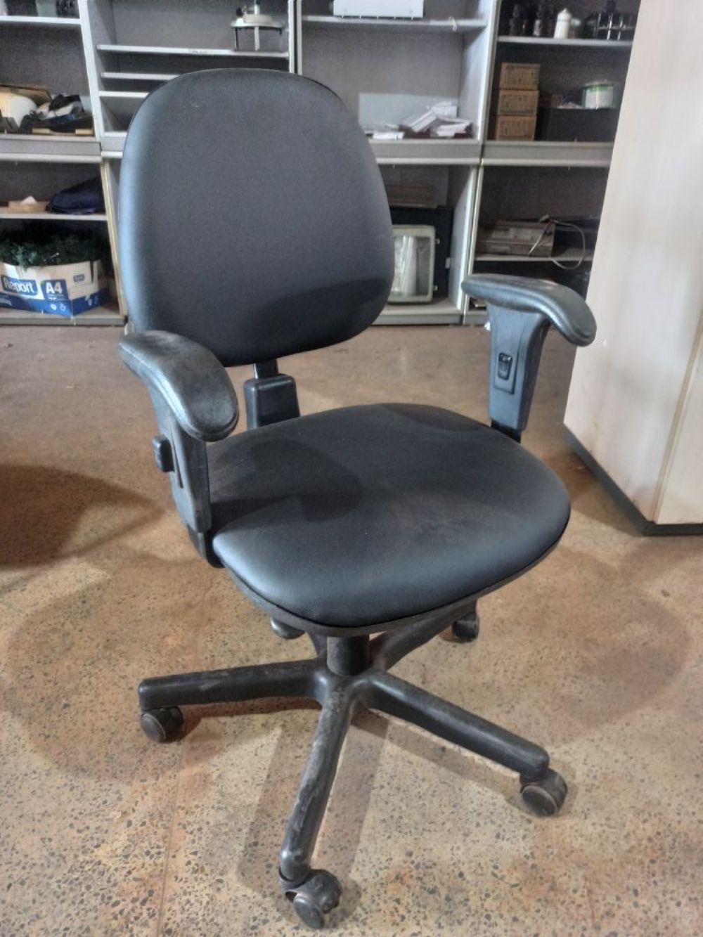 Cadeira giratória com braços e regulagem da altura do assento e regulagem do encosto. Tapeçaria feita no courvin novo.